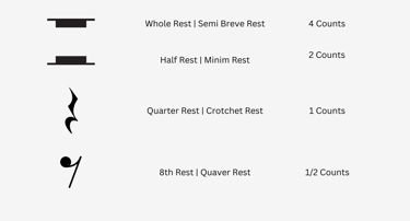Eighth Rest (Quaver Rest): Equals half a beat of silence.