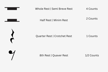 Sixteenth Rest (Semiquaver Rest): Equals a quarter of a beat of silence.